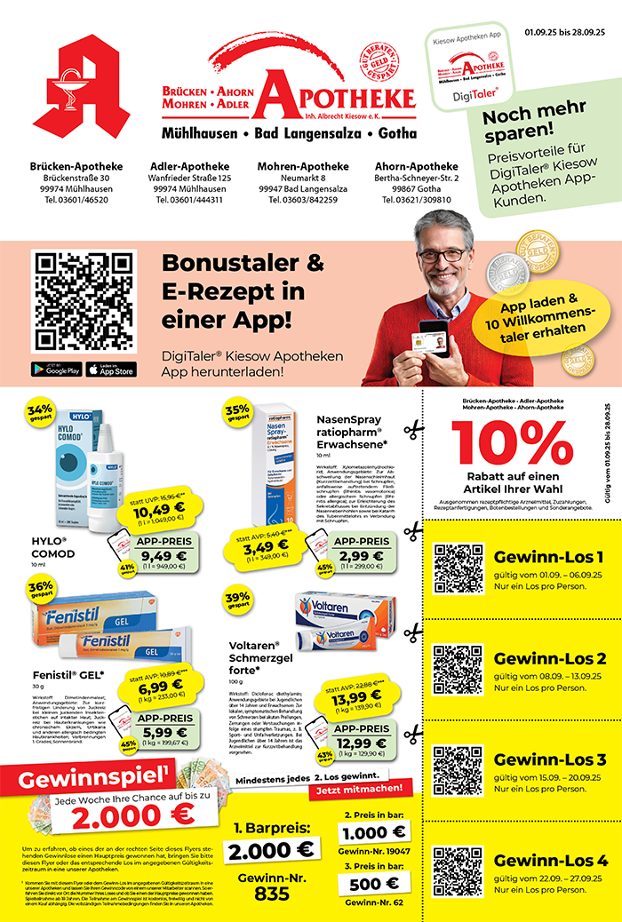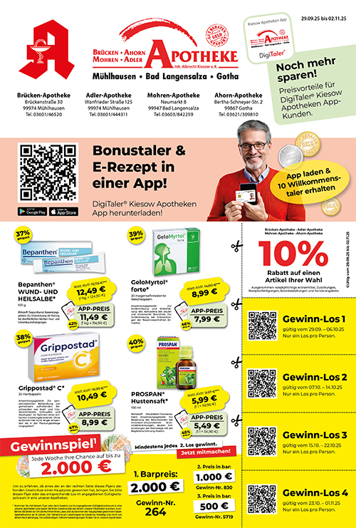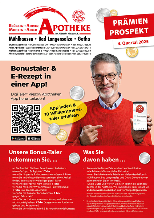 Sammeln Sie Brückentaler und suchen Sie sich eine großartige Belohnung aus – sowohl in unserer Apotheke als auch bei vielen Geschäften in unserer Region. Erfahren Sie mehr über unser Brückentaler-System und die verschiedenen Möglichkeiten!
